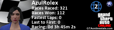 [URL=http://GTAonlinestats.com/showplayer/AzulRolex/2][IMG]http://GTAonlinestats.com/racesignature/AzulRolex/2/sig.png[/IMG][/URL]