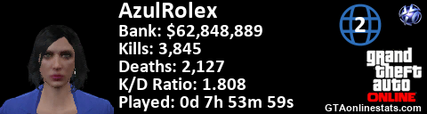 <a href="http://GTAonlinestats.com/showplayer/AzulRolex/2"><img src="http://GTAonlinestats.com/signature/AzulRolex/2/sig.png" alt="AzulRolex" border="0" /></a>