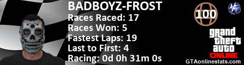 [URL=http://GTAonlinestats.com/showplayer/BADBOYZ-FROST][IMG]http://GTAonlinestats.com/racesignature/BADBOYZ-FROST/sig.png[/IMG][/URL]