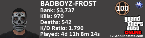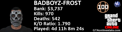 [URL=http://GTAonlinestats.com/showplayer/BADBOYZ-FROST][IMG]http://GTAonlinestats.com/signature/BADBOYZ-FROST/sig.png[/IMG][/URL]