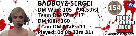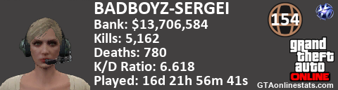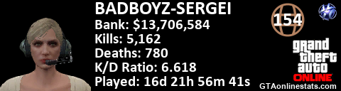 [URL=http://GTAonlinestats.com/showplayer/BADBOYZ-SERGEI][IMG]http://GTAonlinestats.com/signature/BADBOYZ-SERGEI/sig.png[/IMG][/URL]
