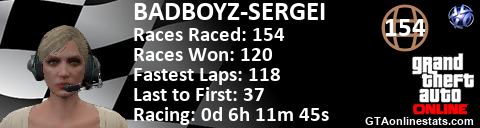[URL=http://GTAonlinestats.com/showplayer/BADBOYZ-SERGEI][IMG]http://GTAonlinestats.com/racesignature/BADBOYZ-SERGEI/sig.png[/IMG][/URL]