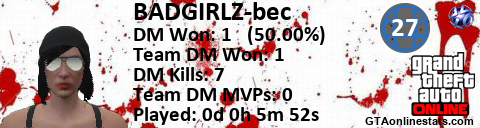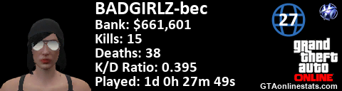<a href="http://GTAonlinestats.com/showplayer/BADGIRLZ-bec"><img src="http://GTAonlinestats.com/signature/BADGIRLZ-bec/sig.png" alt="BADGIRLZ-bec" border="0" /></a>