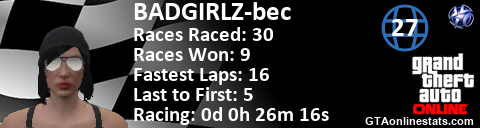 <a href="http://GTAonlinestats.com/showplayer/BADGIRLZ-bec"><img src="http://GTAonlinestats.com/racesignature/BADGIRLZ-bec/sig.png" alt="BADGIRLZ-bec" border="0" /></a>