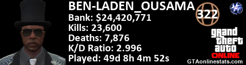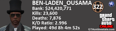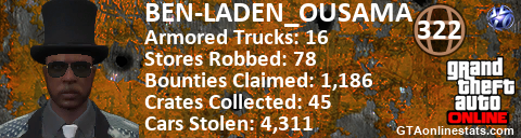 [URL=http://GTAonlinestats.com/showplayer/BEN-LADEN_OUSAMA][IMG]http://GTAonlinestats.com/signature/BEN-LADEN_OUSAMA/sig.png[/IMG][/URL]