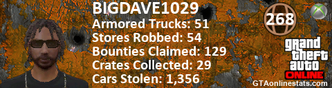 [URL=http://GTAonlinestats.com/showplayer/BIGDAVE1029][IMG]http://GTAonlinestats.com/crimesignature/BIGDAVE1029/sig.png[/IMG][/URL]