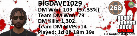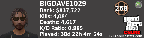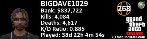 [URL=http://GTAonlinestats.com/showplayer/BIGDAVE1029][IMG]http://GTAonlinestats.com/dmsignature/BIGDAVE1029/sig.png[/IMG][/URL]