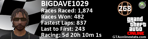 [URL=http://GTAonlinestats.com/showplayer/BIGDAVE1029][IMG]http://GTAonlinestats.com/racesignature/BIGDAVE1029/sig.png[/IMG][/URL]