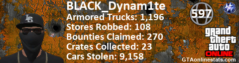 [URL=http://GTAonlinestats.com/showplayer/BLACK_Dynam1te][IMG]http://GTAonlinestats.com/crimesignature/BLACK_Dynam1te/sig.png[/IMG][/URL]