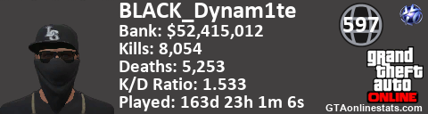[URL=http://GTAonlinestats.com/showplayer/BLACK_Dynam1te][IMG]http://GTAonlinestats.com/dmsignature/BLACK_Dynam1te/sig.png[/IMG][/URL]