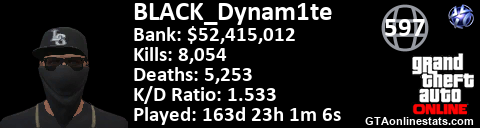 [URL=http://GTAonlinestats.com/showplayer/BLACK_Dynam1te][IMG]http://GTAonlinestats.com/signature/BLACK_Dynam1te/sig.png[/IMG][/URL]