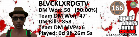 [URL=http://GTAonlinestats.com/showplayer/BLVCKLXRDGTV][IMG]http://GTAonlinestats.com/dmsignature/BLVCKLXRDGTV/sig.png[/IMG][/URL]