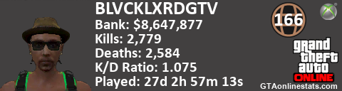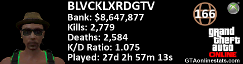 <a href="http://GTAonlinestats.com/showplayer/BLVCKLXRDGTV"><img src="http://GTAonlinestats.com/dmsignature/BLVCKLXRDGTV/sig.png" alt="BLVCKLXRDGTV" border="0" /></a>