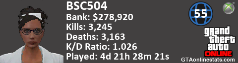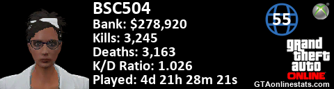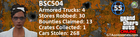 [URL=http://GTAonlinestats.com/showplayer/BSC504/2][IMG]http://GTAonlinestats.com/crimesignature/BSC504/2/sig.png[/IMG][/URL]