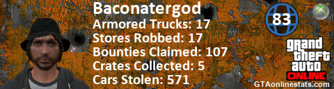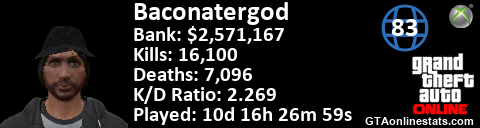 <a href="http://GTAonlinestats.com/showplayer/Baconatergod"><img src="http://GTAonlinestats.com/randomsignature/Baconatergod/sig.png" alt="BaconaterGod" border="0" /></a>