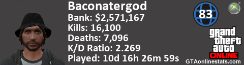 [URL=http://GTAonlinestats.com/showplayer/Baconatergod][IMG]http://GTAonlinestats.com/signature/Baconatergod/sig.png[/IMG][/URL]
