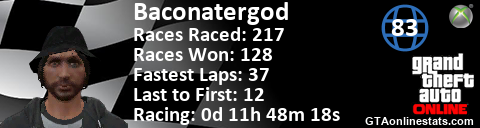 [URL=http://GTAonlinestats.com/showplayer/Baconatergod][IMG]http://GTAonlinestats.com/racesignature/Baconatergod/sig.png[/IMG][/URL]