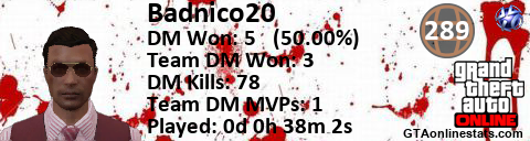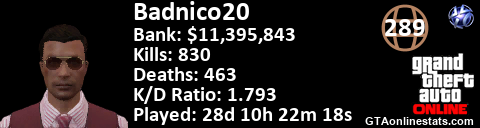<a href="http://GTAonlinestats.com/showplayer/Badnico20"><img src="http://GTAonlinestats.com/dmsignature/Badnico20/sig.png" alt="Badnico20" border="0" /></a>