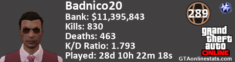 [URL=http://GTAonlinestats.com/showplayer/Badnico20][IMG]http://GTAonlinestats.com/signature/Badnico20/sig.png[/IMG][/URL]