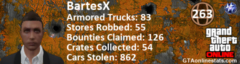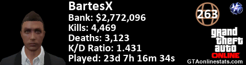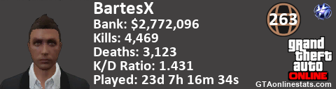 [URL=http://GTAonlinestats.com/showplayer/BartesX][IMG]http://GTAonlinestats.com/signature/BartesX/sig.png[/IMG][/URL]