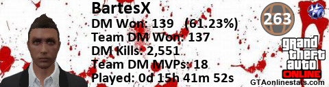 [URL=http://GTAonlinestats.com/showplayer/BartesX][IMG]http://GTAonlinestats.com/dmsignature/BartesX/sig.png[/IMG][/URL]