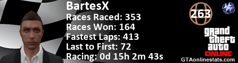 [URL=http://GTAonlinestats.com/showplayer/BartesX][IMG]http://GTAonlinestats.com/racesignature/BartesX/sig.png[/IMG][/URL]