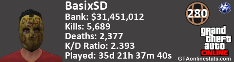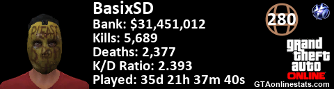 [URL=http://GTAonlinestats.com/showplayer/BasixSD][IMG]http://GTAonlinestats.com/signature/BasixSD/sig.png[/IMG][/URL]
