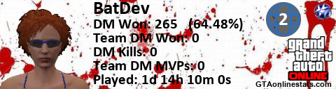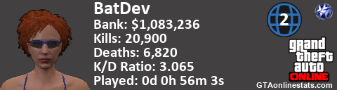 [URL=http://GTAonlinestats.com/showplayer/BatDev/2][IMG]http://GTAonlinestats.com/dmsignature/BatDev/2/sig.png[/IMG][/URL]
