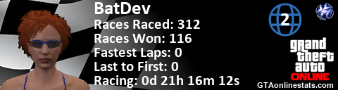 <a href="http://GTAonlinestats.com/showplayer/BatDev/2"><img src="http://GTAonlinestats.com/racesignature/BatDev/2/sig.png" alt="BatDev" border="0" /></a>