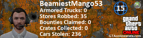 [URL=http://GTAonlinestats.com/showplayer/BeamiestMango53][IMG]http://GTAonlinestats.com/crimesignature/BeamiestMango53/sig.png[/IMG][/URL]