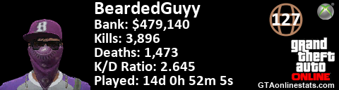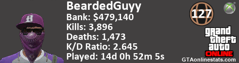 [URL=http://GTAonlinestats.com/showplayer/BeardedGuyy][IMG]http://GTAonlinestats.com/dmsignature/BeardedGuyy/sig.png[/IMG][/URL]