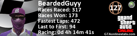 [URL=http://GTAonlinestats.com/showplayer/BeardedGuyy][IMG]http://GTAonlinestats.com/racesignature/BeardedGuyy/sig.png[/IMG][/URL]
