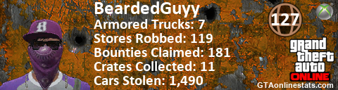 [URL=http://GTAonlinestats.com/showplayer/BeardedGuyy][IMG]http://GTAonlinestats.com/signature/BeardedGuyy/sig.png[/IMG][/URL]