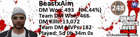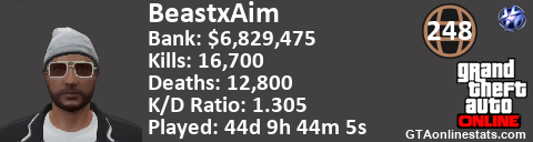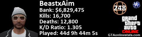 <a href="http://GTAonlinestats.com/showplayer/BeastxAim"><img src="http://GTAonlinestats.com/dmsignature/BeastxAim/sig.png" alt="BeastxAim" border="0" /></a>