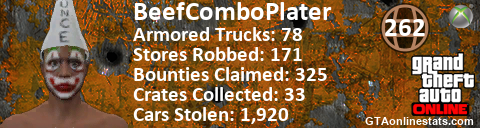 [URL=http://GTAonlinestats.com/showplayer/BeefComboPlater][IMG]http://GTAonlinestats.com/crimesignature/BeefComboPlater/sig.png[/IMG][/URL]
