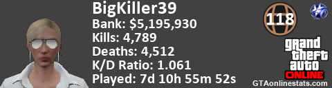 <a href="http://GTAonlinestats.com/showplayer/BigKiller39"><img src="http://GTAonlinestats.com/randomsignature/BigKiller39/sig.png" alt="BigKiller39" border="0" /></a>
