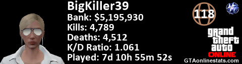<a href="http://GTAonlinestats.com/showplayer/BigKiller39"><img src="http://GTAonlinestats.com/dmsignature/BigKiller39/sig.png" alt="BigKiller39" border="0" /></a>