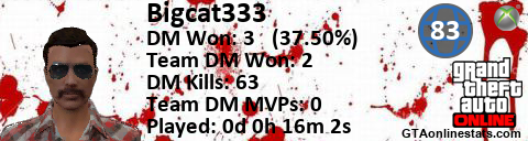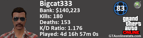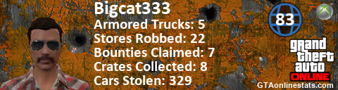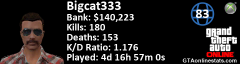 [URL=http://GTAonlinestats.com/showplayer/Bigcat333][IMG]http://GTAonlinestats.com/signature/Bigcat333/sig.png[/IMG][/URL]