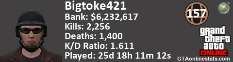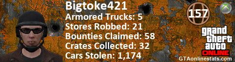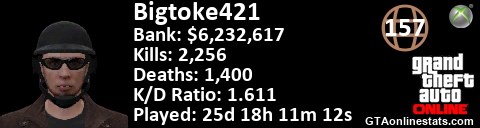 <a href="http://GTAonlinestats.com/showplayer/Bigtoke421"><img src="http://GTAonlinestats.com/signature/Bigtoke421/sig.png" alt="Bigtoke421" border="0" /></a>