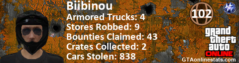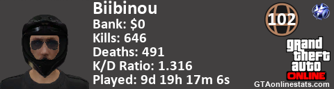 [URL=http://GTAonlinestats.com/showplayer/Biibinou][IMG]http://GTAonlinestats.com/randomsignature/Biibinou/sig.png[/IMG][/URL]