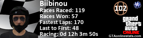 <a href="http://GTAonlinestats.com/showplayer/Biibinou"><img src="http://GTAonlinestats.com/racesignature/Biibinou/sig.png" alt="Biibinou" border="0" /></a>