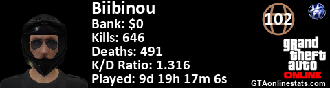 [URL=http://GTAonlinestats.com/showplayer/Biibinou][IMG]http://GTAonlinestats.com/signature/Biibinou/sig.png[/IMG][/URL]