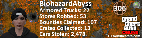[URL=http://GTAonlinestats.com/showplayer/BiohazardAbyss][IMG]http://GTAonlinestats.com/crimesignature/BiohazardAbyss/sig.png[/IMG][/URL]