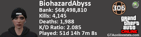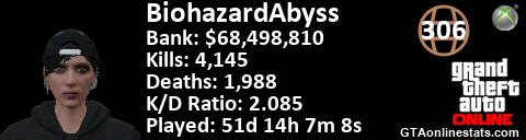 <a href="http://GTAonlinestats.com/showplayer/BiohazardAbyss"><img src="http://GTAonlinestats.com/dmsignature/BiohazardAbyss/sig.png" alt="BiohazardAbyss" border="0" /></a>
