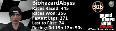 <a href="http://GTAonlinestats.com/showplayer/BiohazardAbyss"><img src="http://GTAonlinestats.com/racesignature/BiohazardAbyss/sig.png" alt="BiohazardAbyss" border="0" /></a>