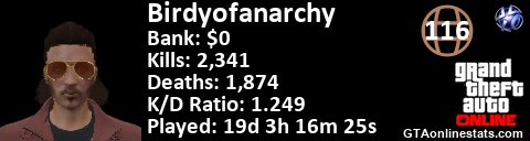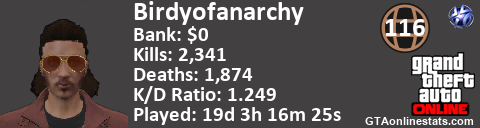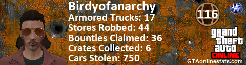 [URL=http://GTAonlinestats.com/showplayer/Birdyofanarchy][IMG]http://GTAonlinestats.com/randomsignature/Birdyofanarchy/sig.png[/IMG][/URL]