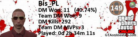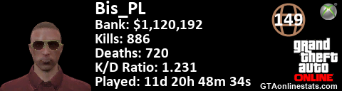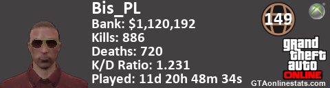 <a href="http://GTAonlinestats.com/showplayer/Bis_PL"><img src="http://GTAonlinestats.com/signature/Bis_PL/sig.png" alt="Bis_PL" border="0" /></a>