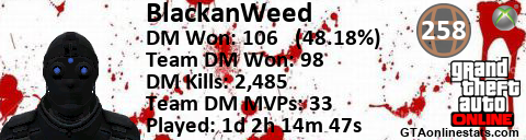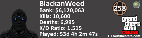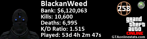 [URL=http://GTAonlinestats.com/showplayer/BlackanWeed][IMG]http://GTAonlinestats.com/dmsignature/BlackanWeed/sig.png[/IMG][/URL]
