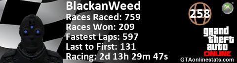 [URL=http://GTAonlinestats.com/showplayer/BlackanWeed][IMG]http://GTAonlinestats.com/racesignature/BlackanWeed/sig.png[/IMG][/URL]