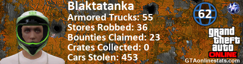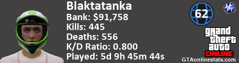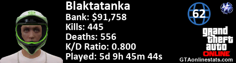 <a href="http://GTAonlinestats.com/showplayer/Blaktatanka"><img src="http://GTAonlinestats.com/randomsignature/Blaktatanka/sig.png" alt="Blaktatanka" border="0" /></a>